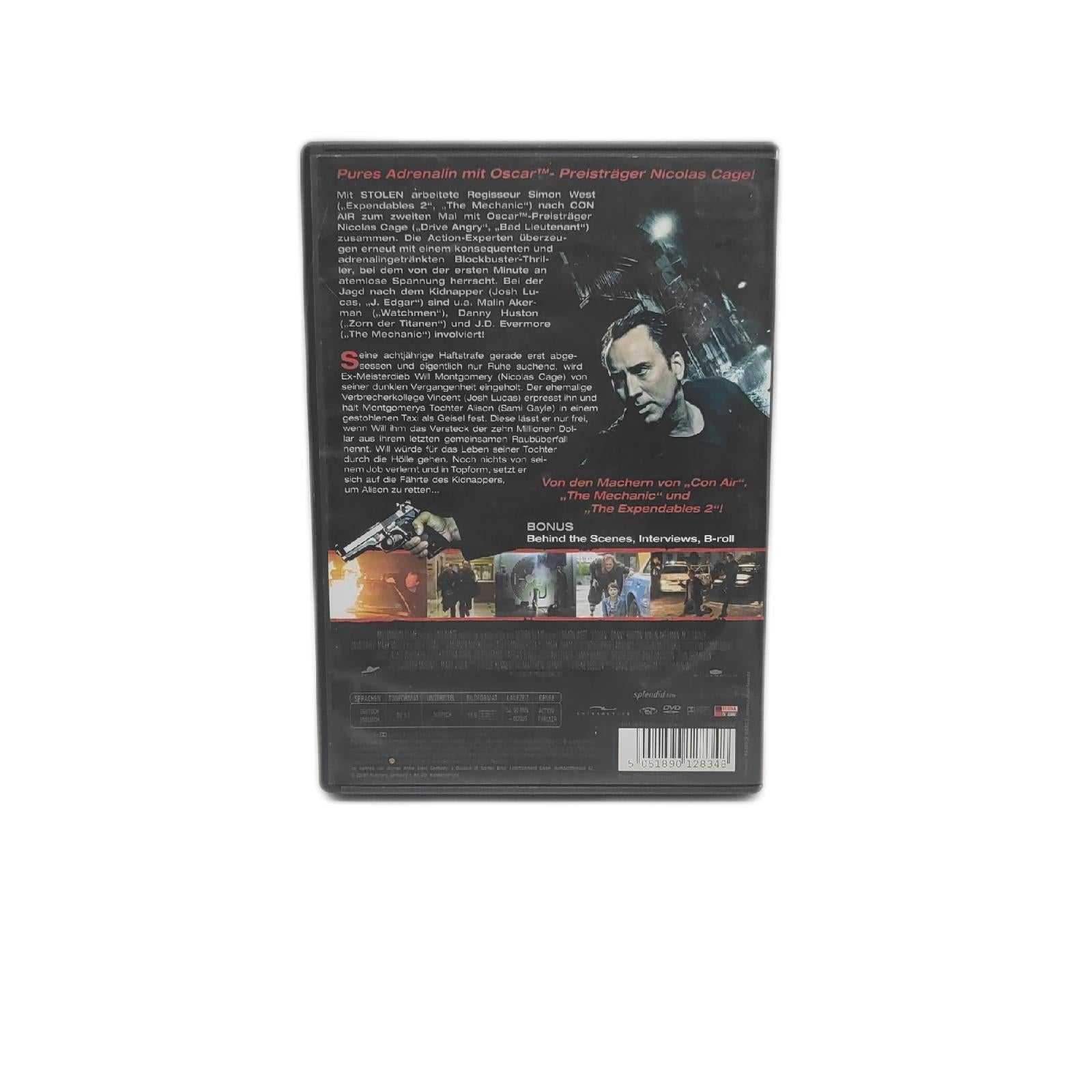 Tauche ein in die spannende Welt des Verbrechens mit \"Stolen\" auf DVD. In dieser packenden Actionthriller wird Nicolas Cage als genialer Dieb auf eine nervenzerreißende Mission geschickt, um seine entführte Tochter zu retten. Mit atemberaubenden Verfolgungsjagden und überraschenden Wendungen fesselt der Film von Anfang bis Ende. Erlebe die intensive Performance von Cage in einer seiner besten Rollen und genieße die hochspannende Inszenierung dieses packenden Thrillers. \"Stolen\" ist ein Must-Have für alle Fans von Adrenalin geladenen Actionfilmen.